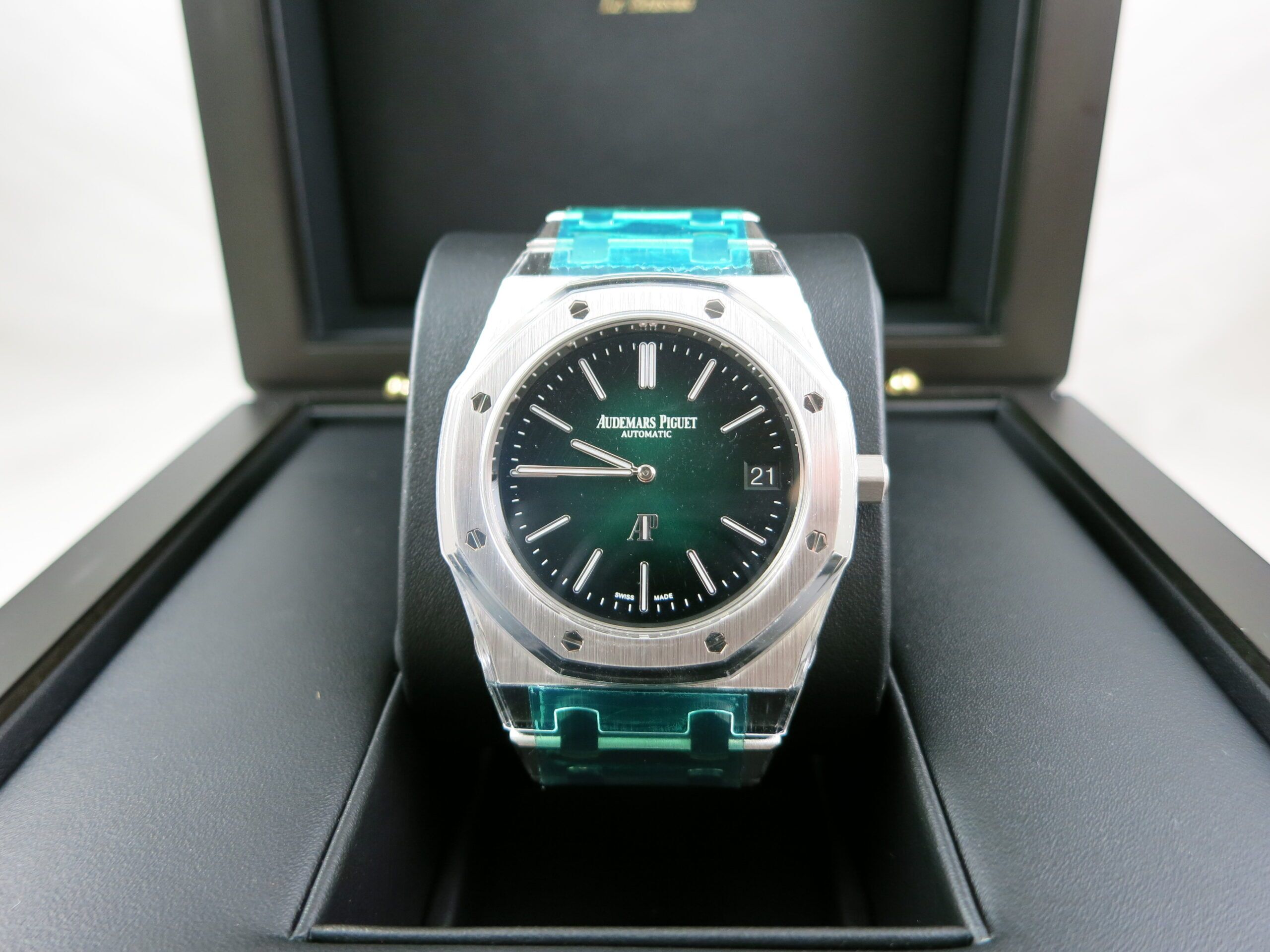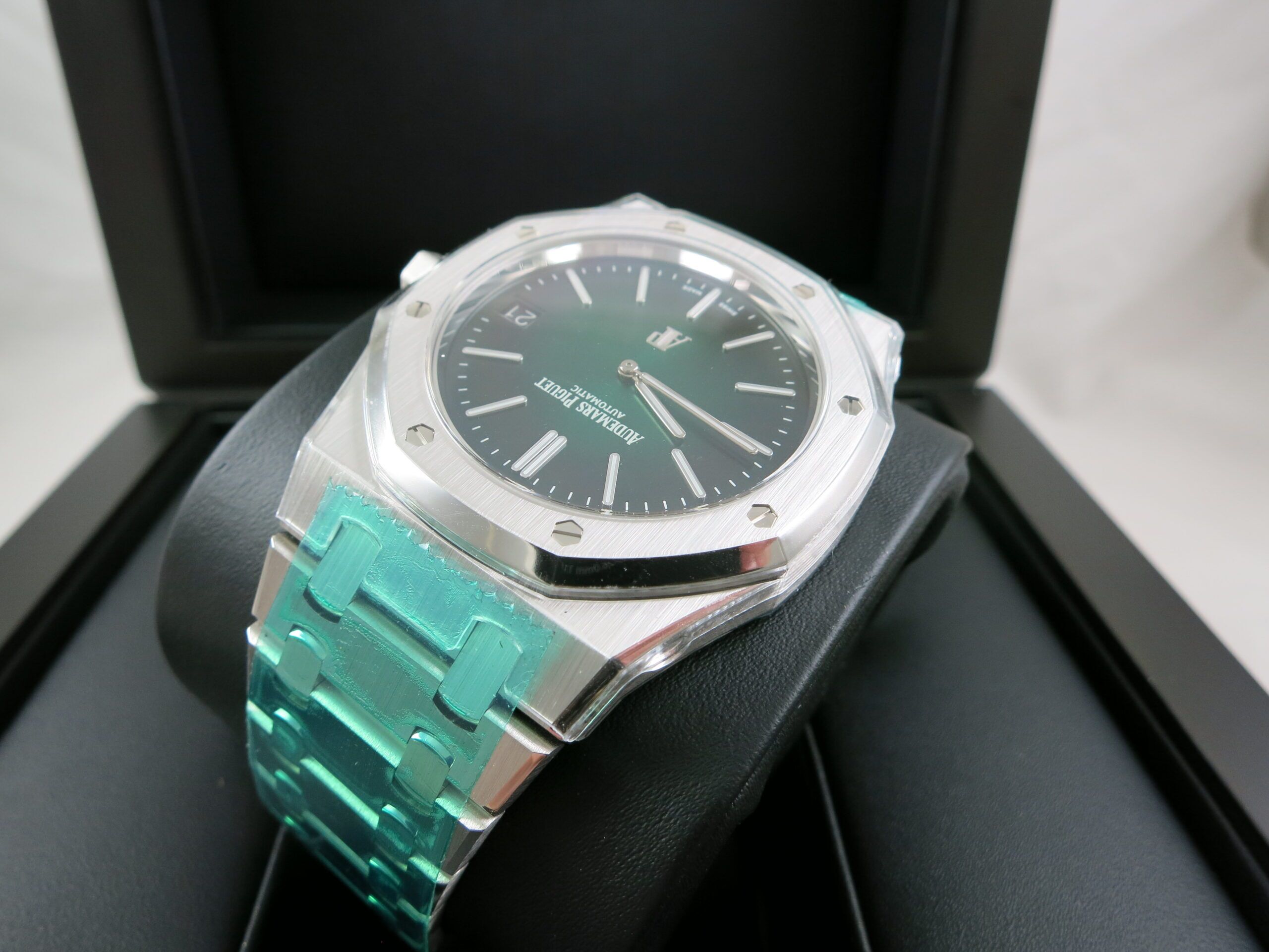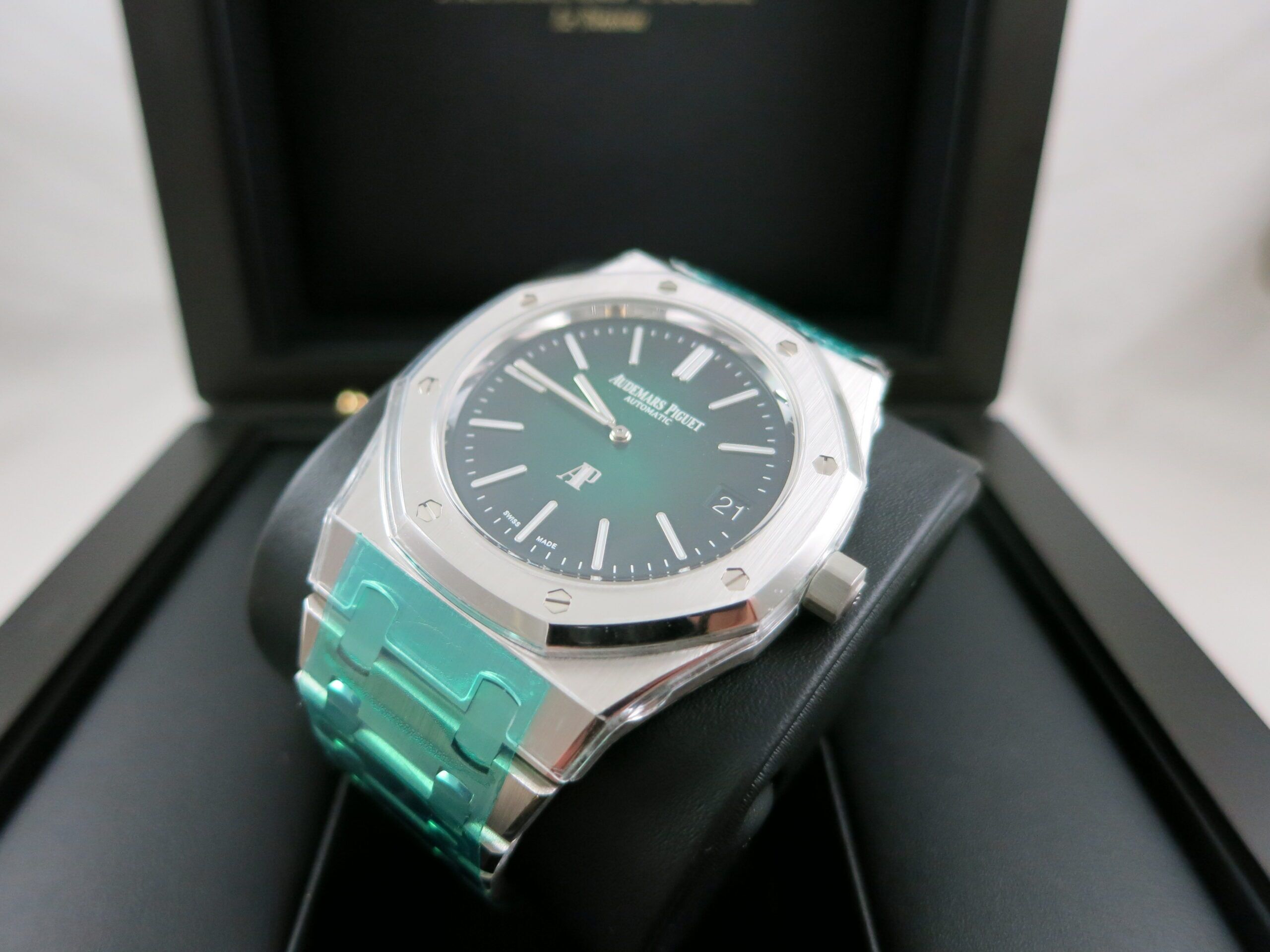 For sale is an unworn and completely factory sealed Audemars Piguet Royal Oak 16202PT green Dial complete set. This is the newest ultra thin model and is 39mm.