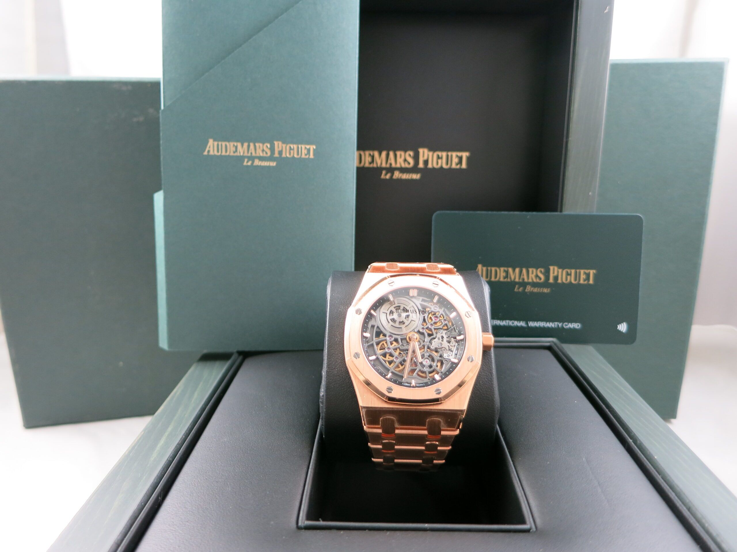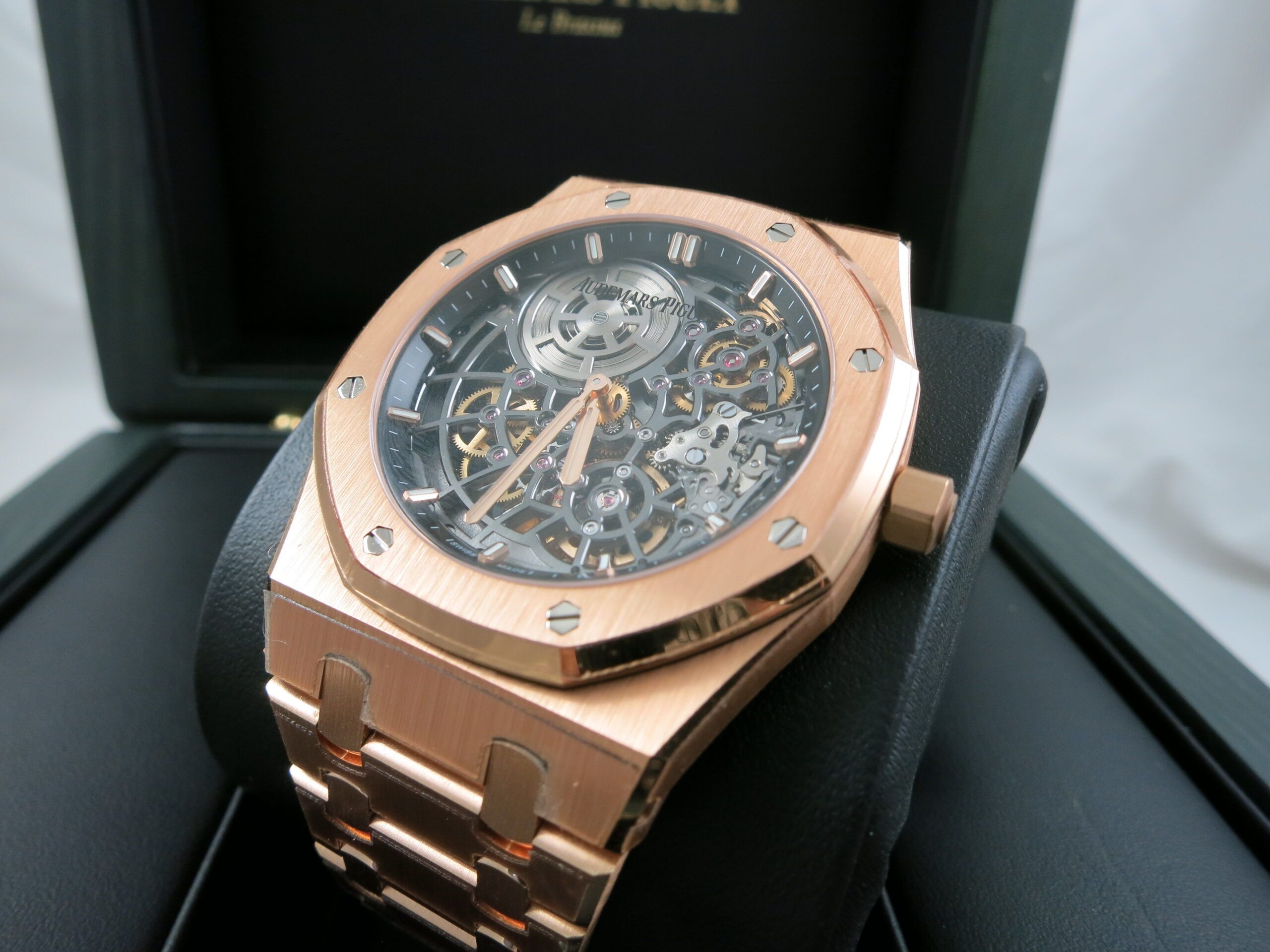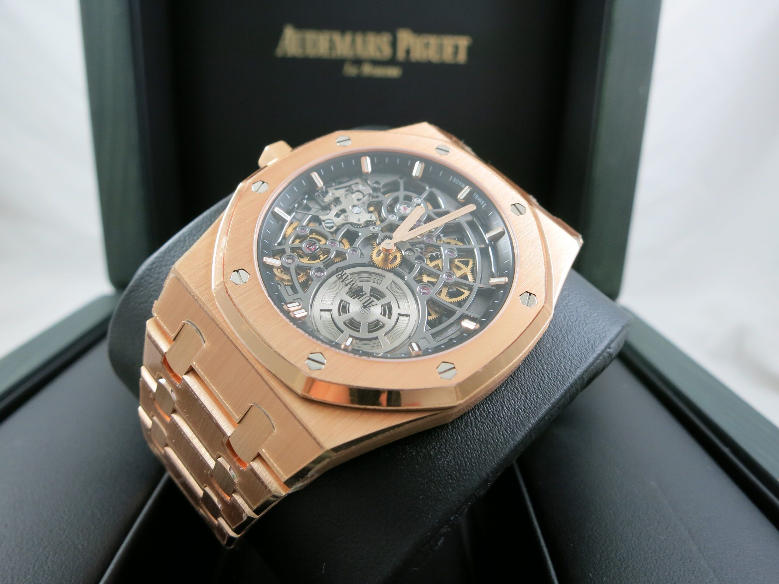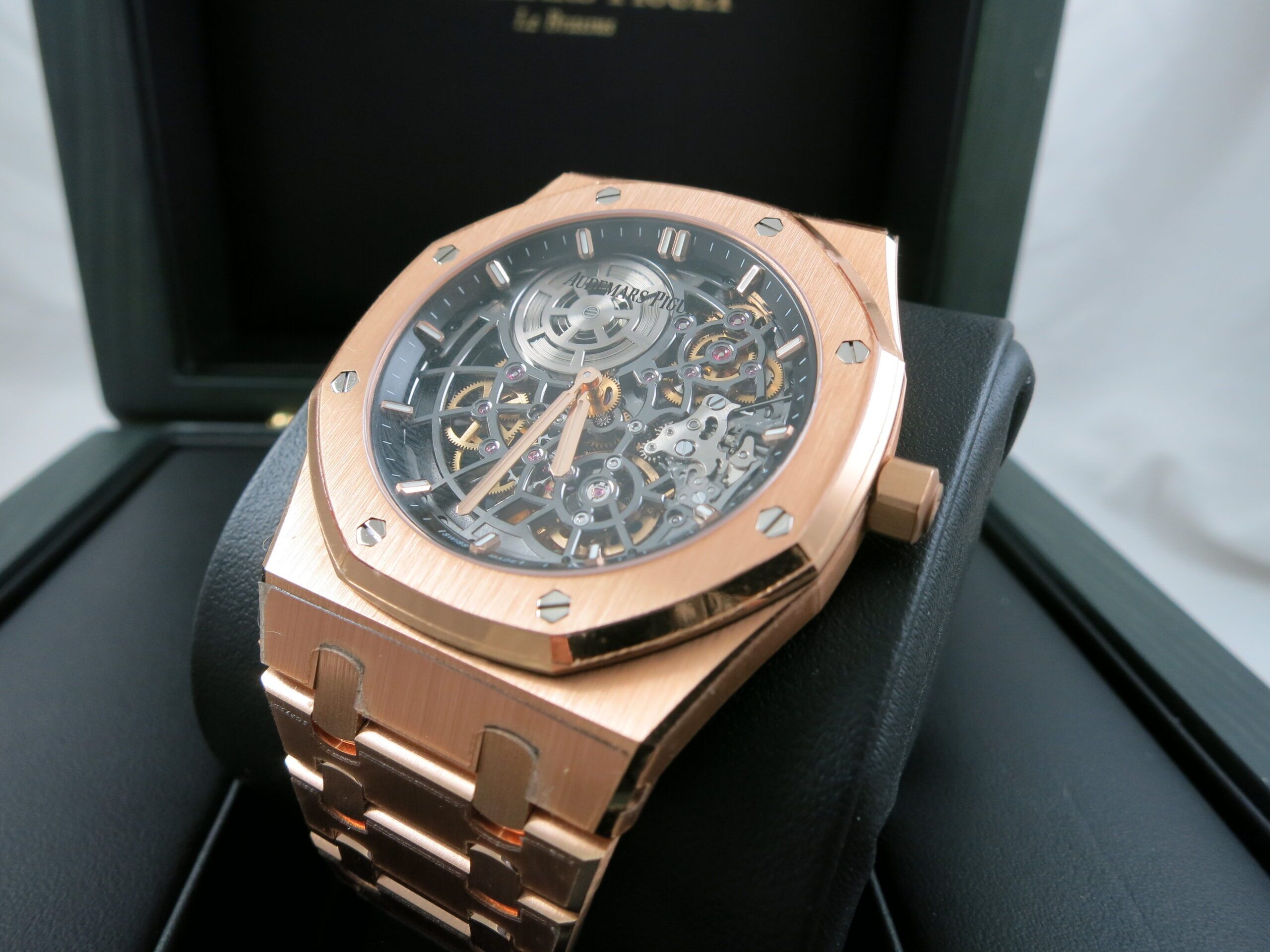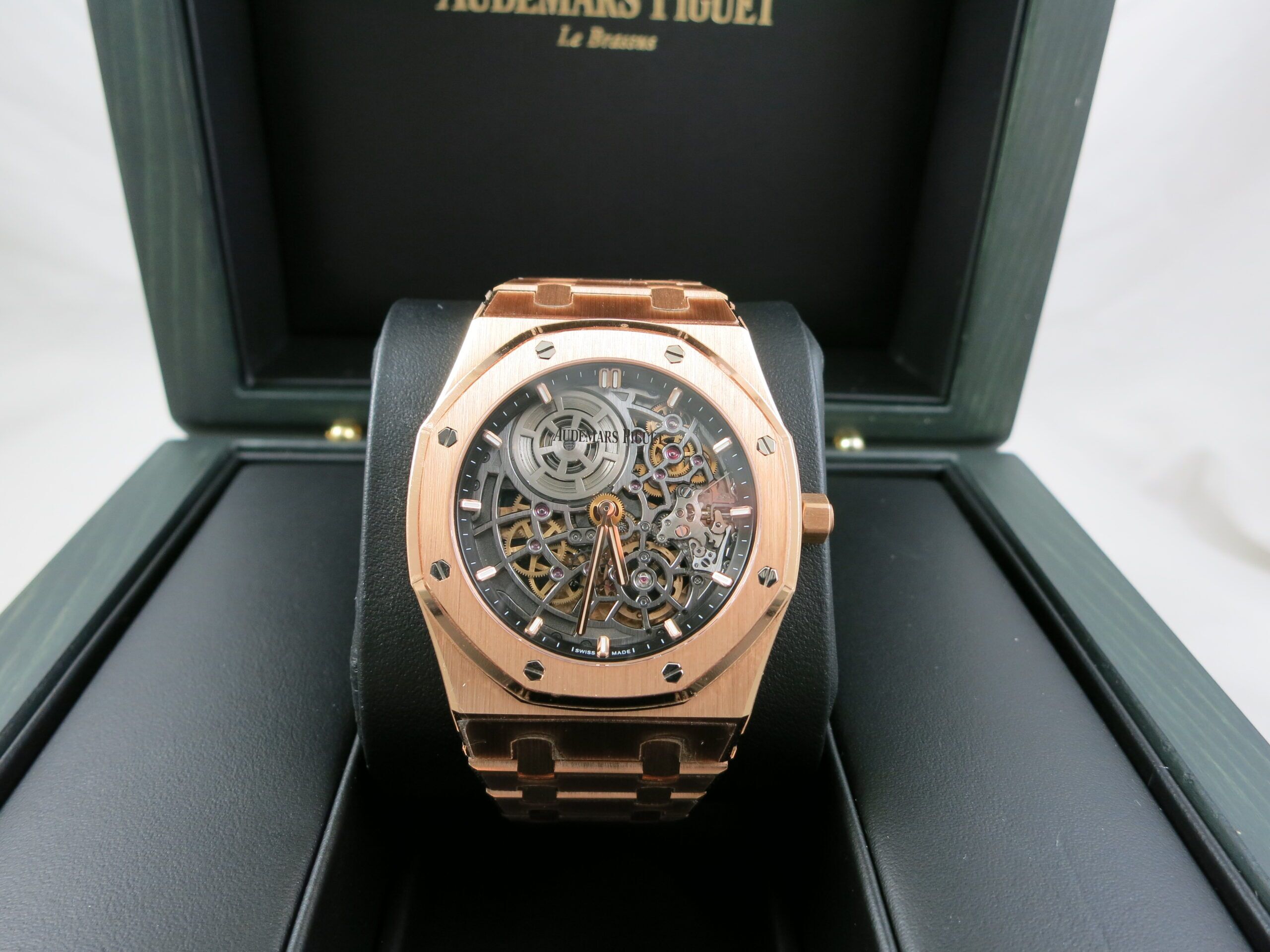 Now available at Swiss Watch Time is a remarkable 50th Anniversary Royal Oak Ultra Thin with a fully skeletonized dial. This masterpiece has an automatic movement and comes complete with box and papers. It is in unworn condition.