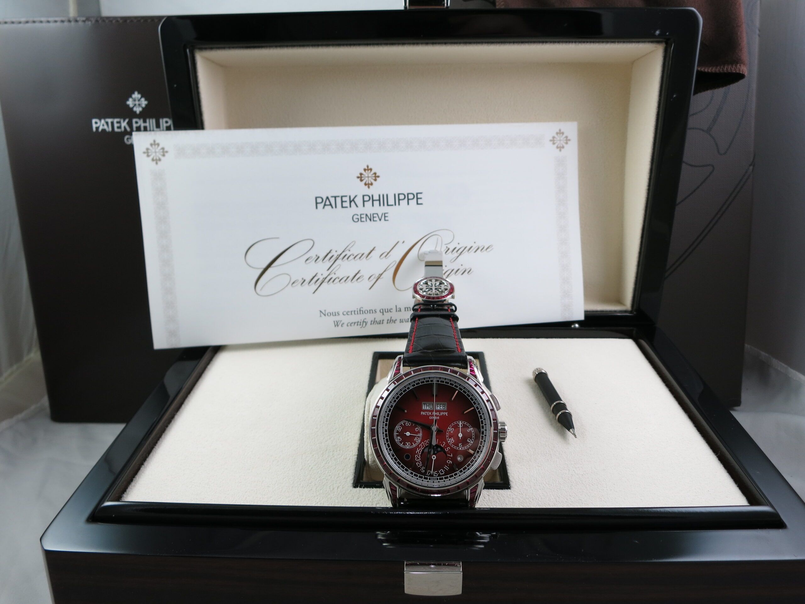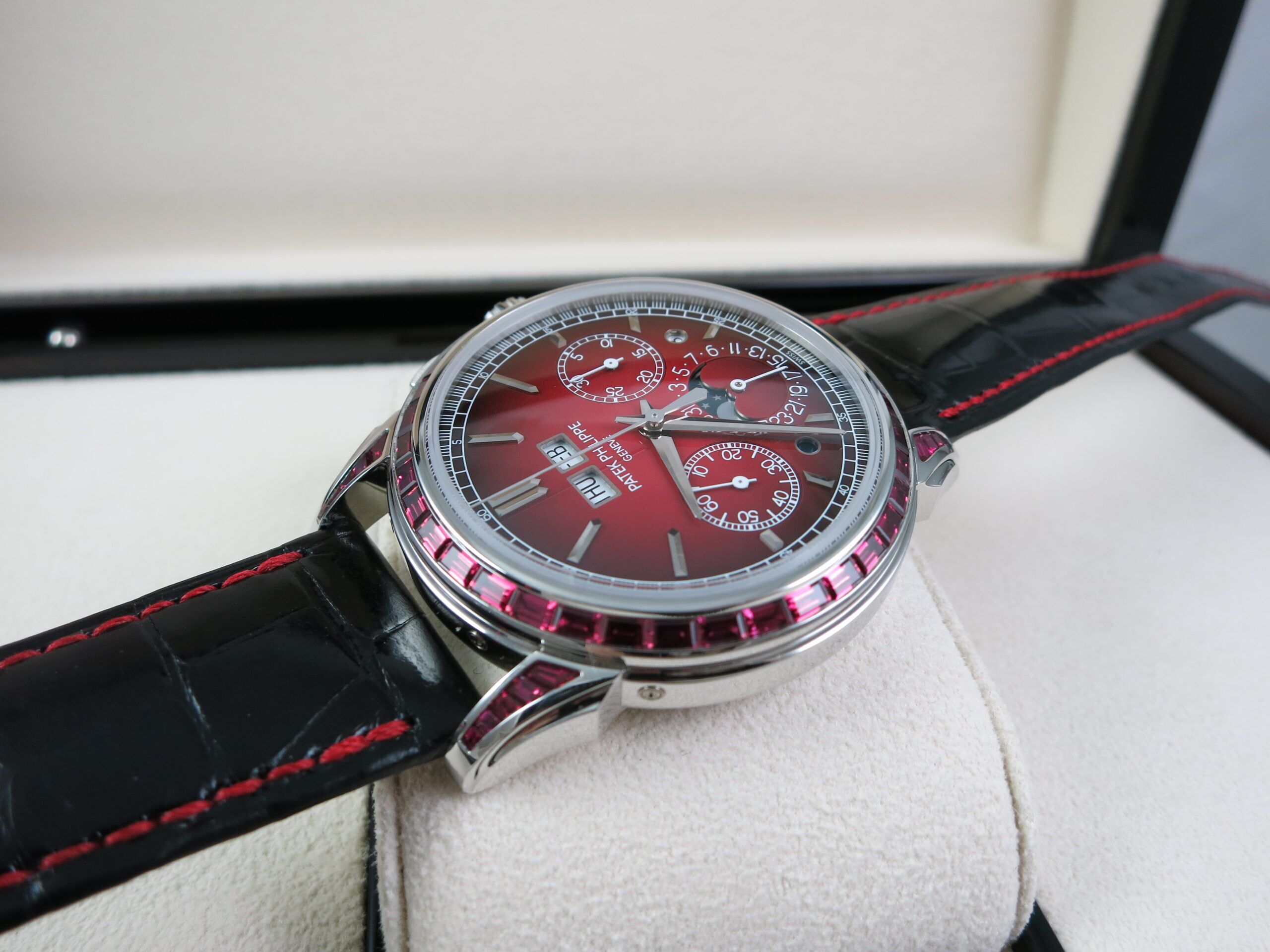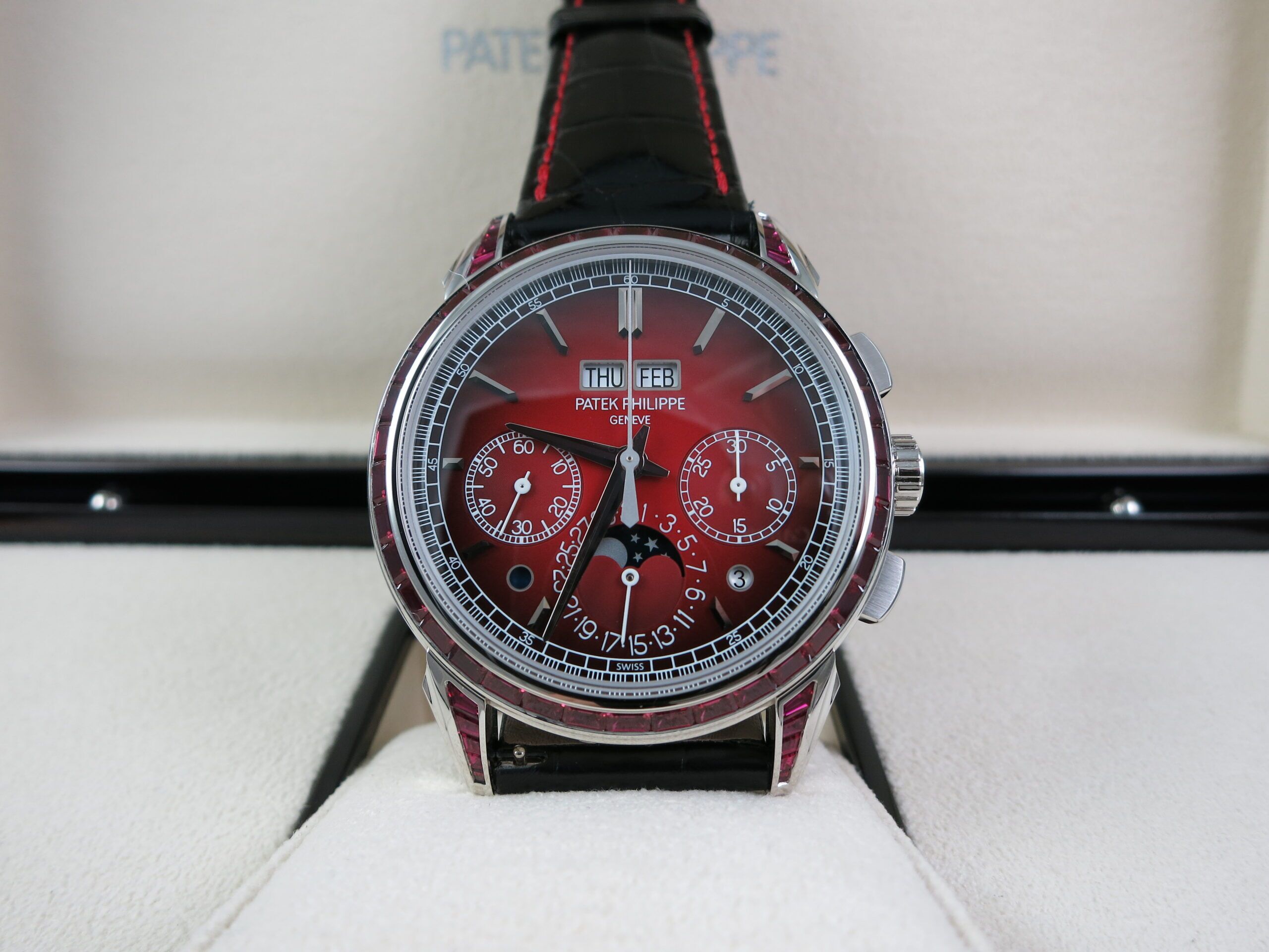 We are pleased to present an extremely rare Patek Philippe 5271 in Platinum with an exceedingly rare red dial along with factory set baguette ruby bezel and baguette ruby lugs. This is one of the rarest Patek Philippes in their current collection including all application pieces. This watch comes complete with box and papers all manuals and inner & outer boxes.