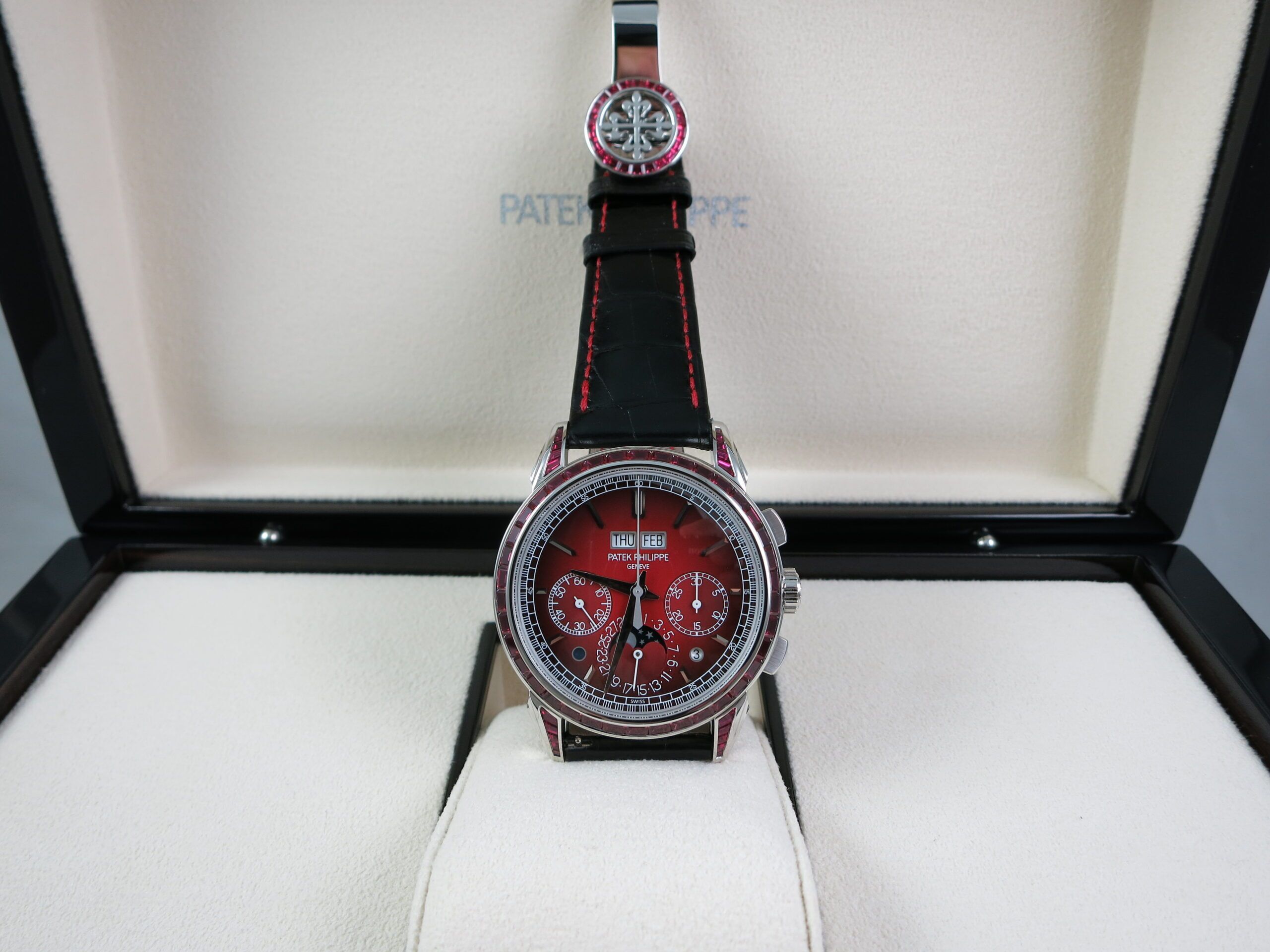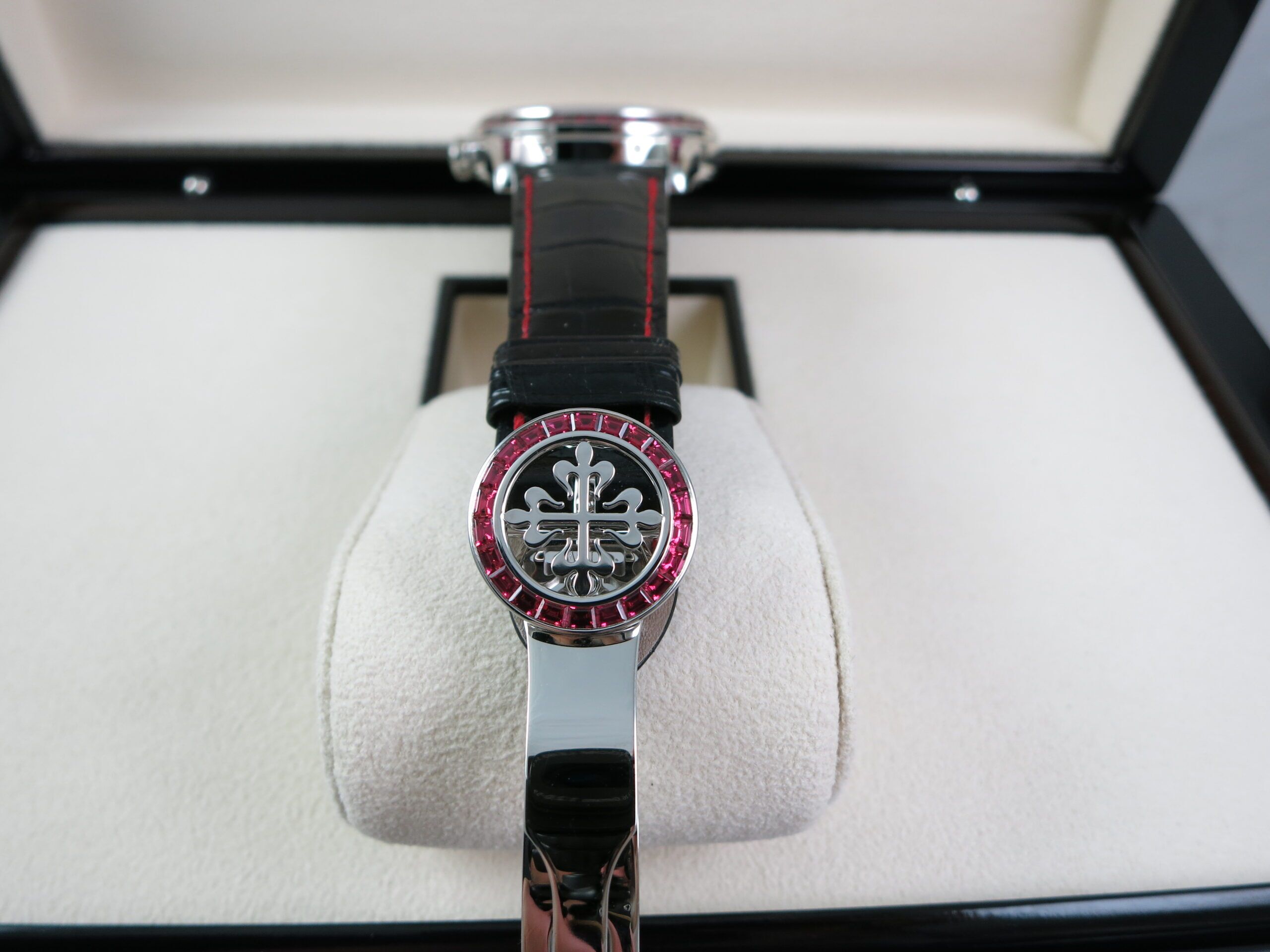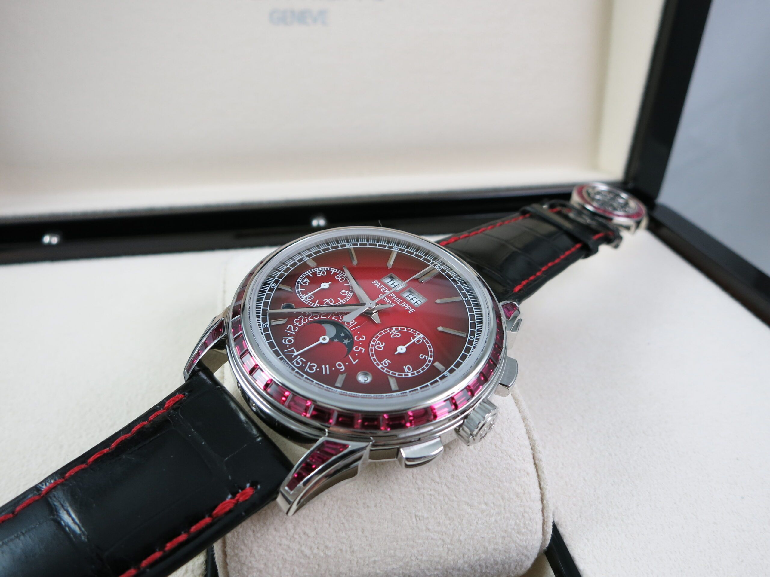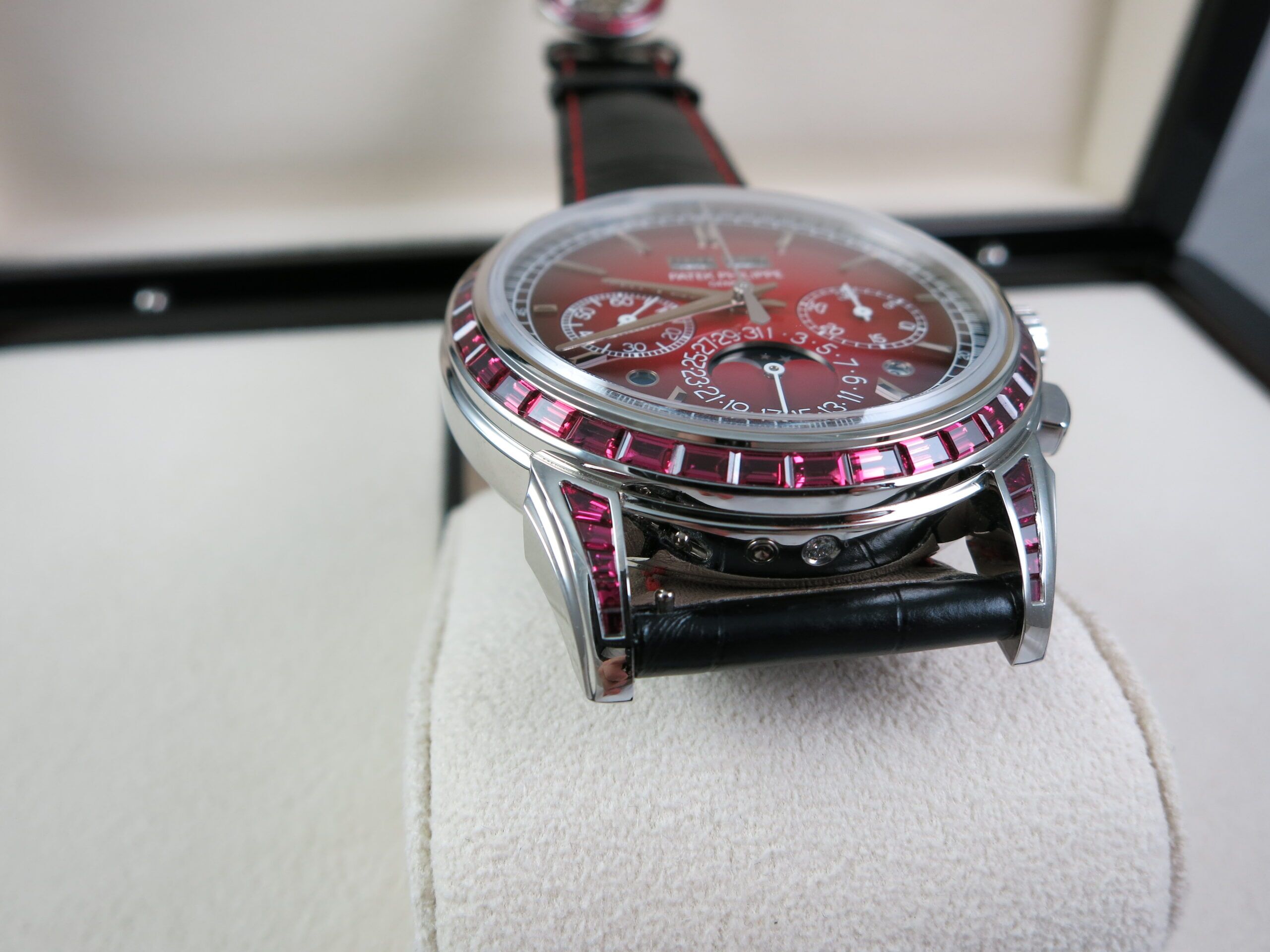 Patek Philippe Factory Set Gemstone specs: 58 baguette-cut rubies: 4.11 cts. (bezel and lugs). 22 baguette-cut rubies: 1.14 ct. (clasp). Total of 80 baguette-cut rubies (5.25 cts).