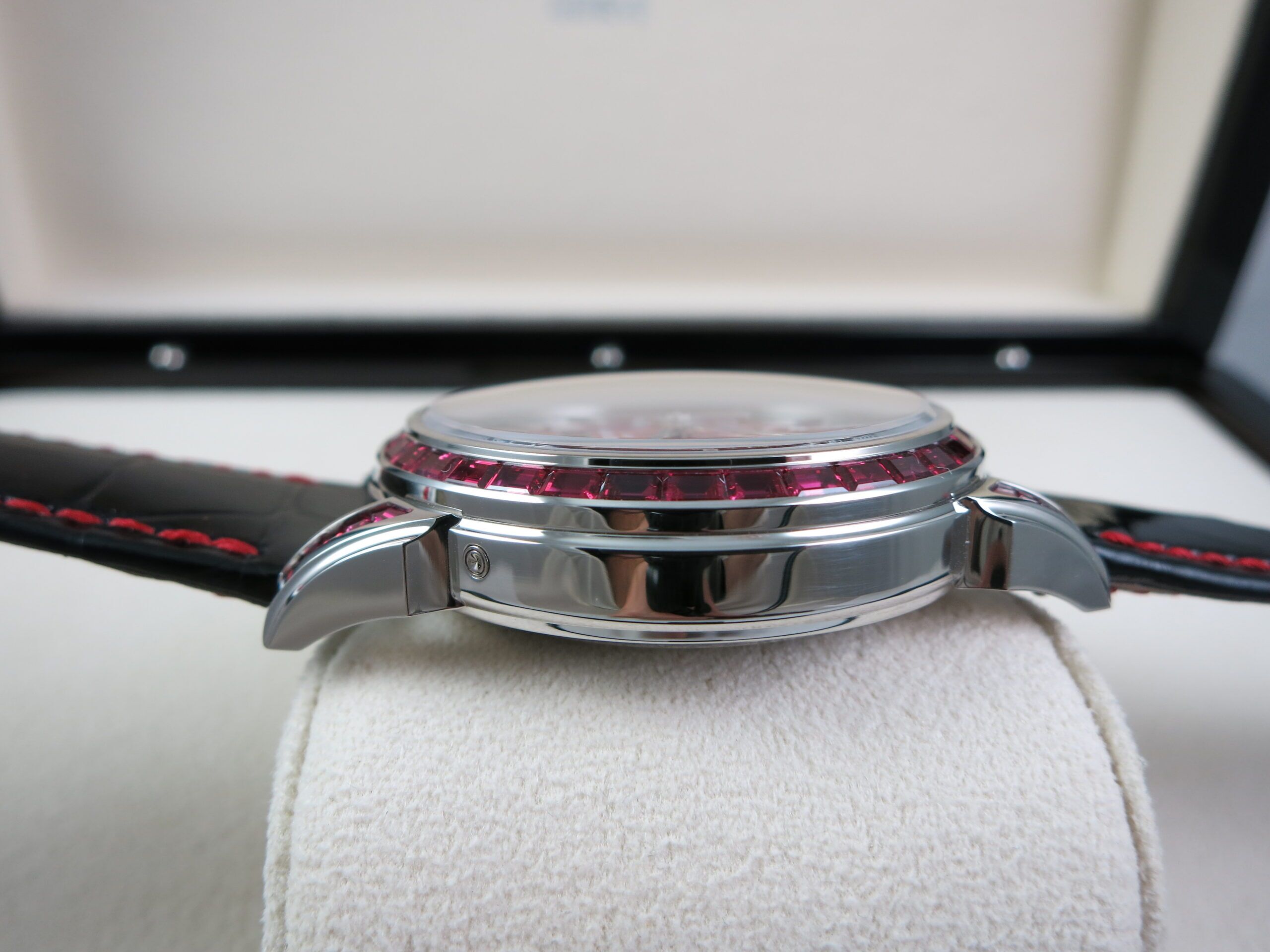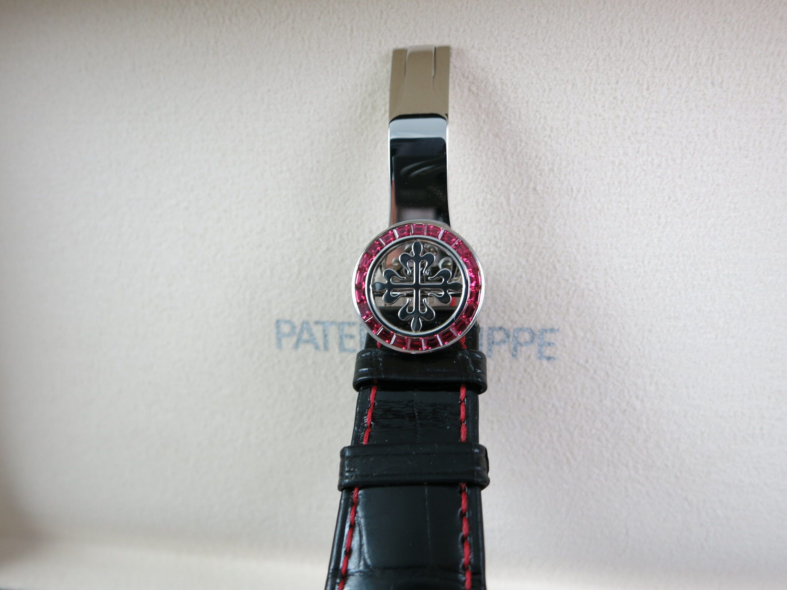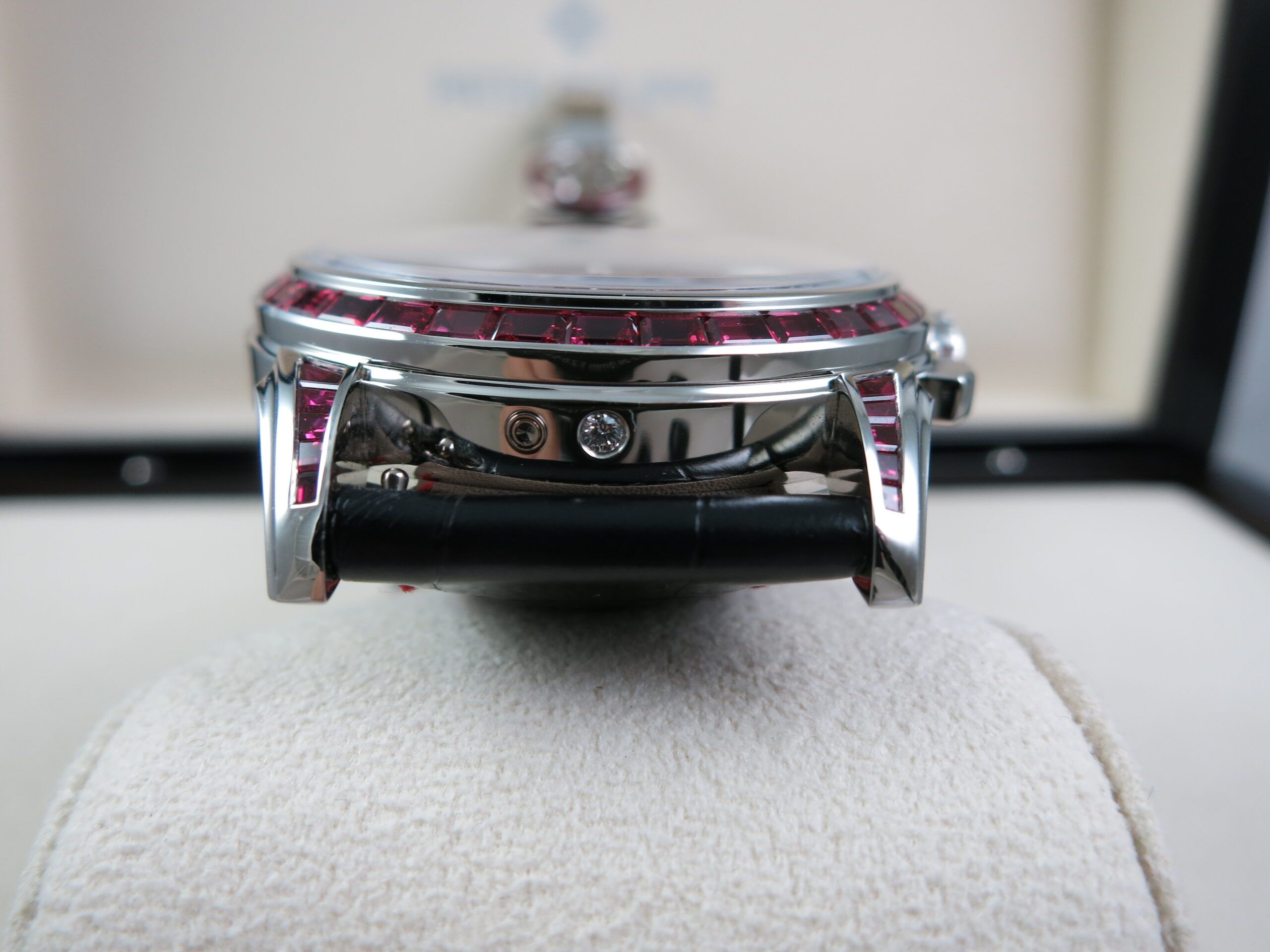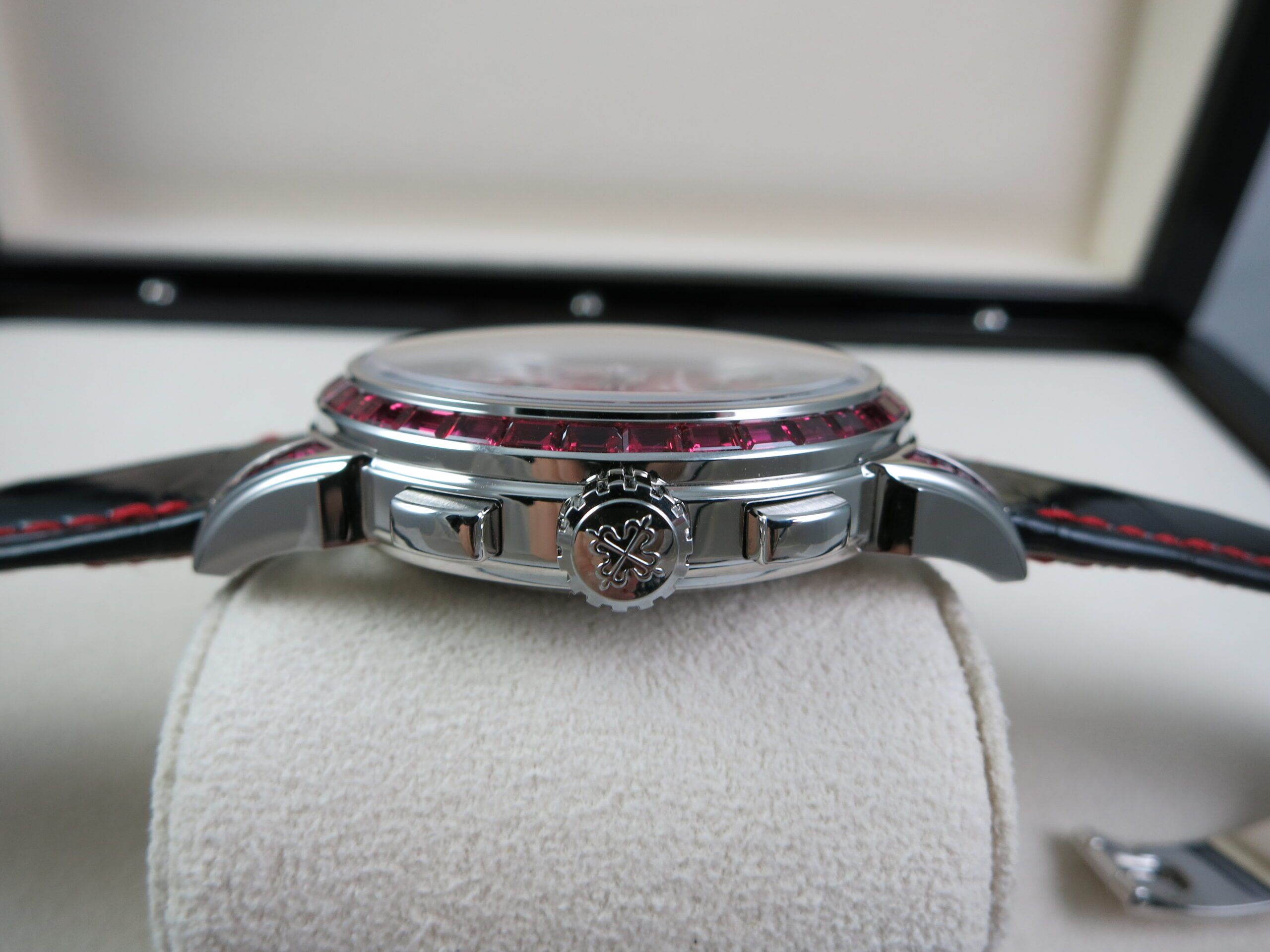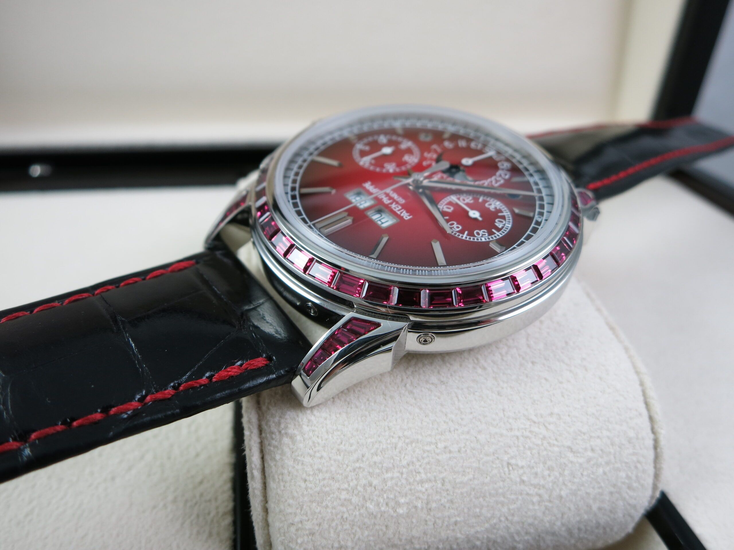 Patek Philippe Factory Set Gemstone specs: 58 baguette-cut rubies: 4.11 cts. (bezel and lugs). 22 baguette-cut rubies: 1.14 ct. (clasp). Total of 80 baguette-cut rubies (5.25 cts).