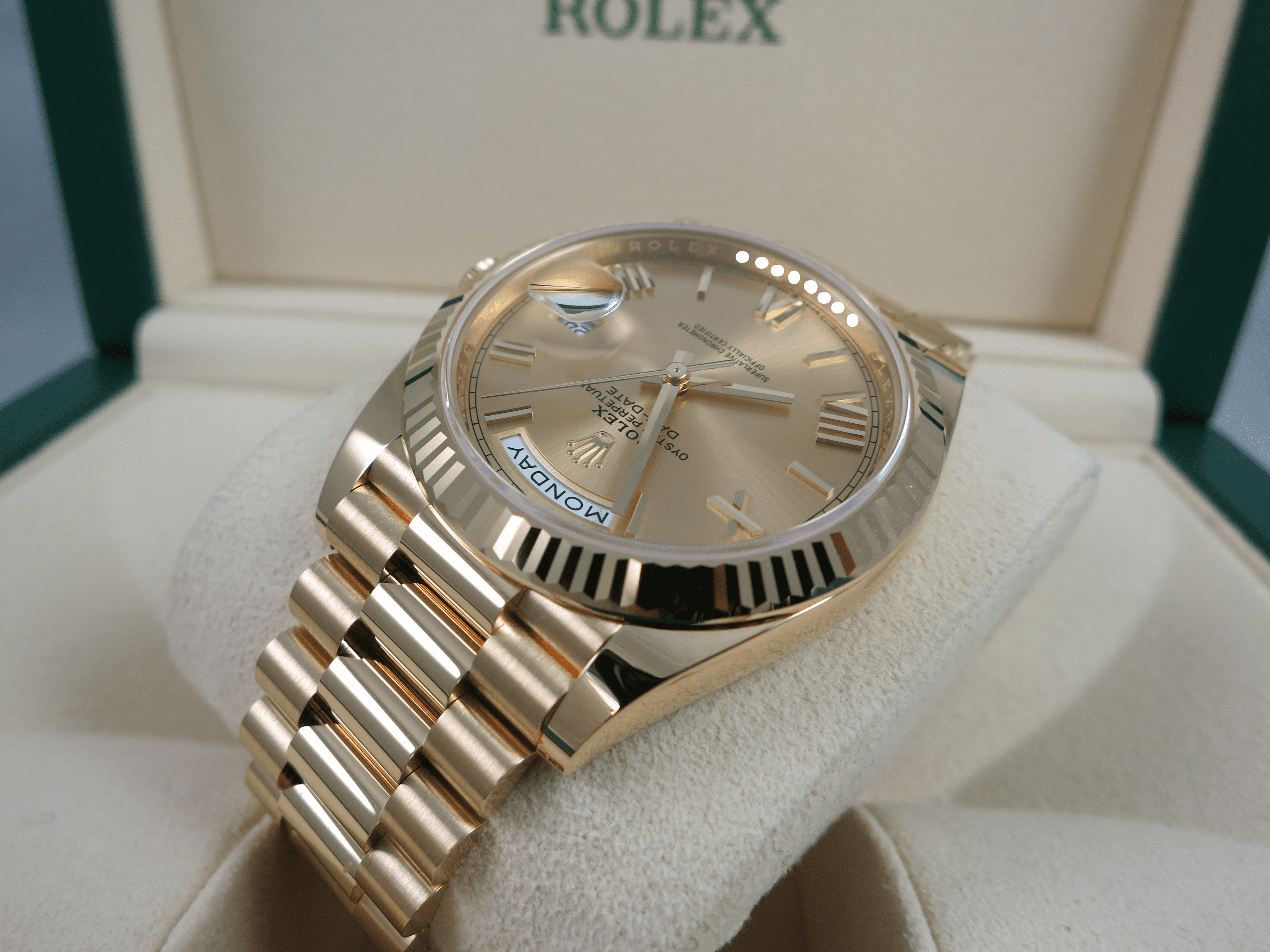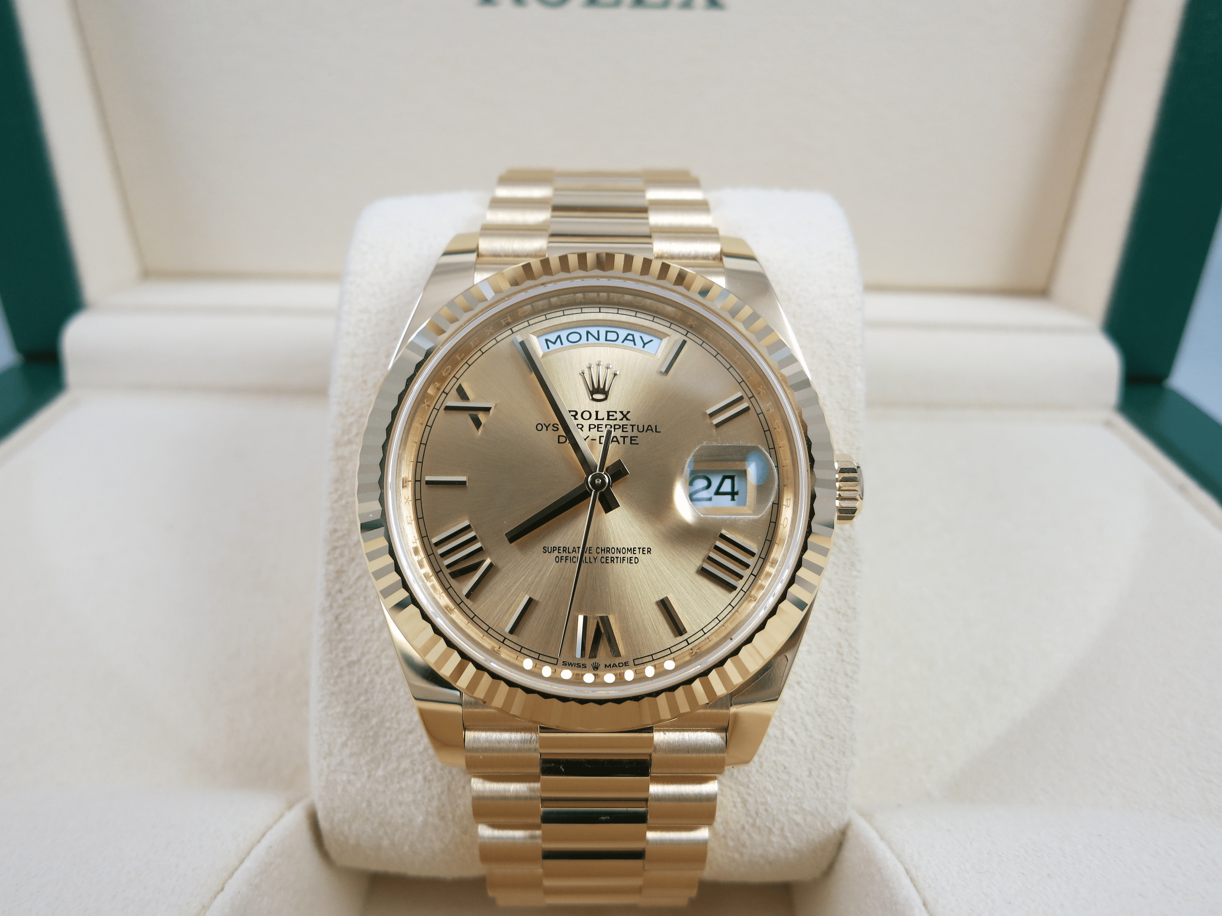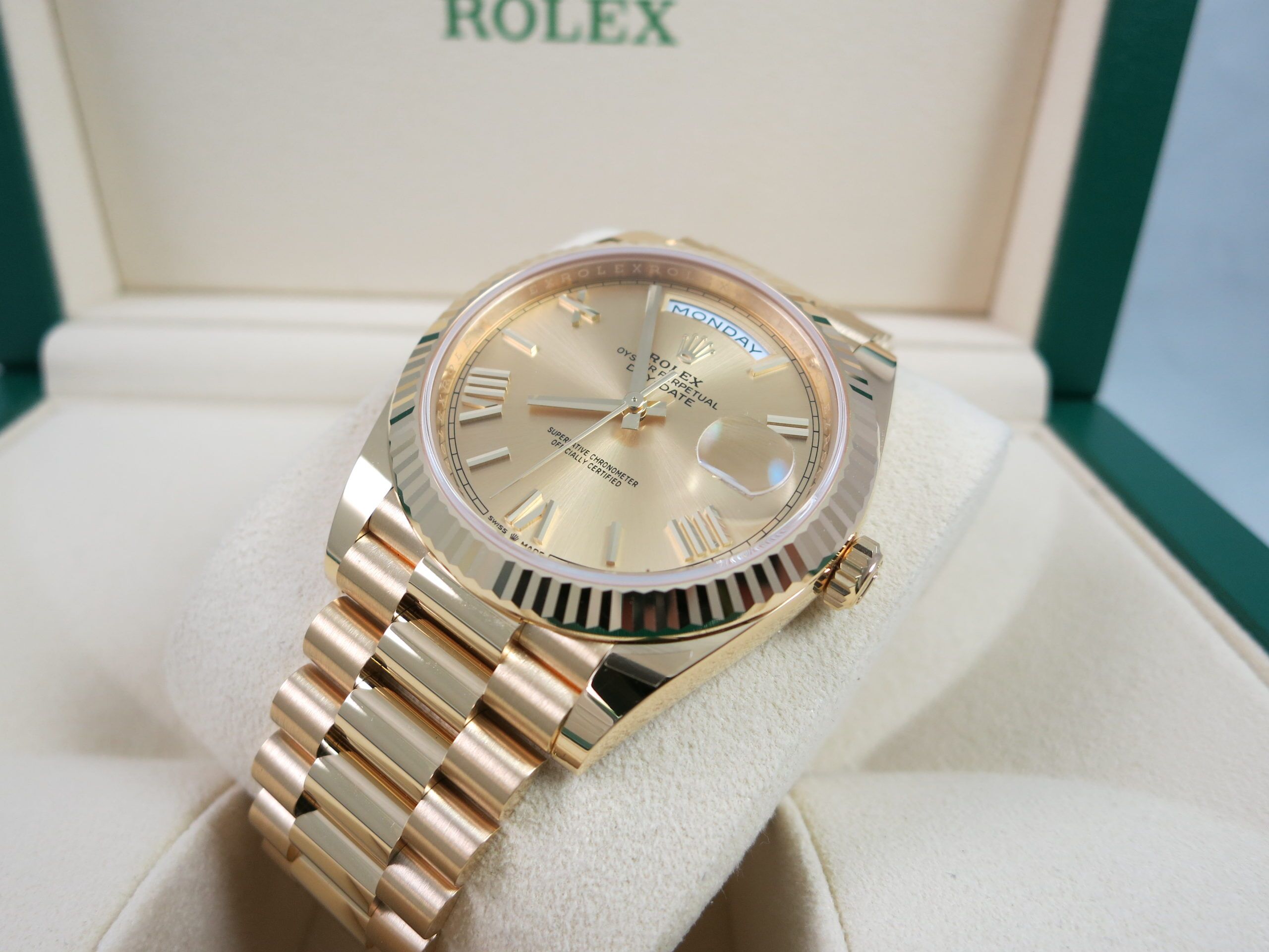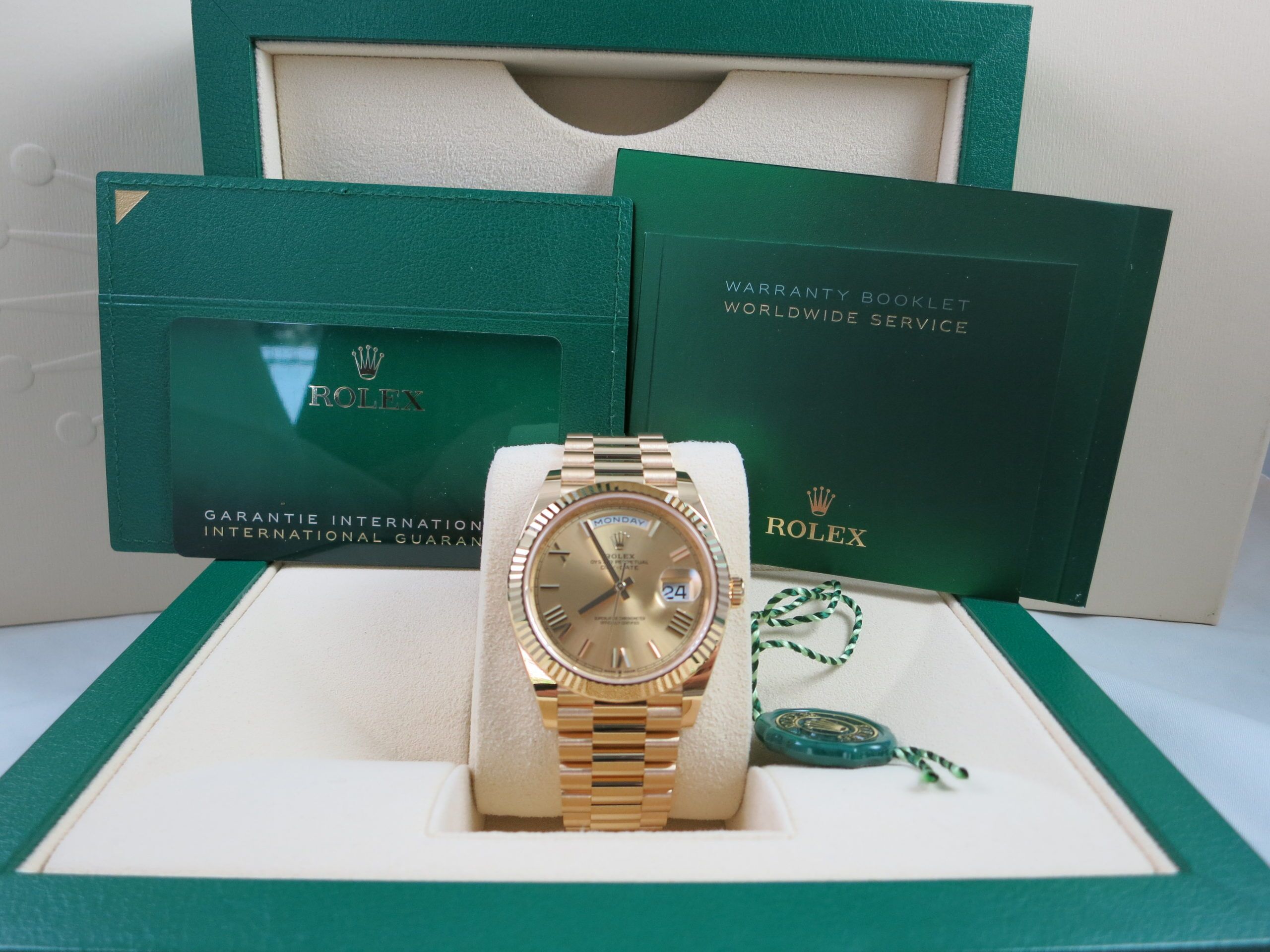 For sale is a new unworn Rolex Day Date 40mm with champagne roman dial model 228238 complete with box and papers.